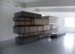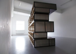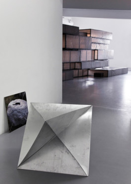 Core element of the show is a structure bordering on both sculpture and architecture. Initiated in homage to a 1926 monument to Karl Liebknecht and Rosa Luxemburg by German architect Mies van der Rohe, this work functions, in the spatial sense, to block one’s field of vision whilst at the same time, through its use of camouflage material, to mimic the act of disappearance. Van der Rohe's original monument was destroyed by the army during the Nazi regime. Through its manifestation in consultation and collaboration with the Tarnen und Täuschen army unit, Schwarzlose's work forms a cycle of appearance and disappearance. This work thus manifests a paradoxical existence as a disguised monument to a monument.